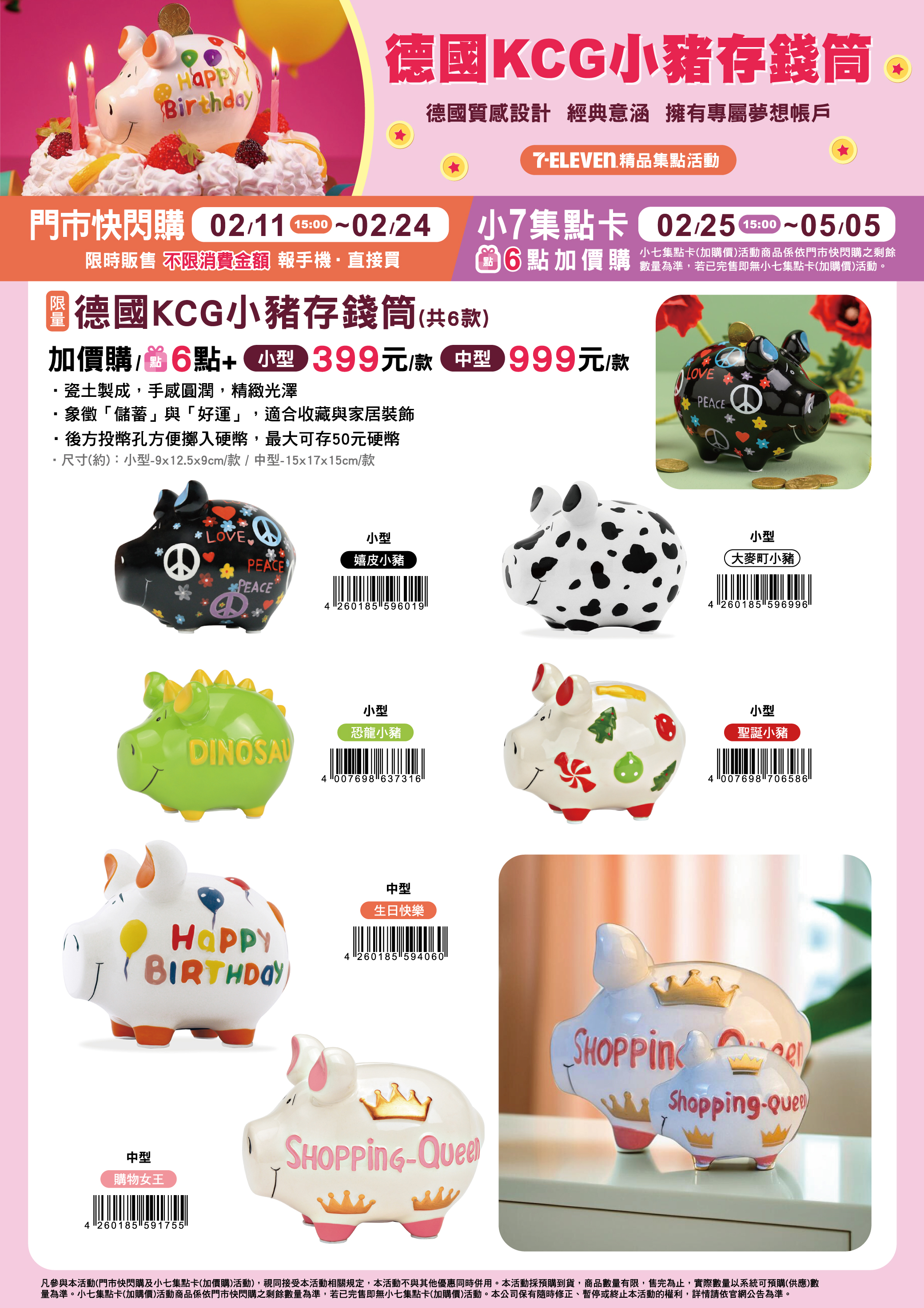- 下列商品,自02/25(三)15:00開始:限量德國KCG小豬存錢筒,共6款(小型4款/中型2款),前述商品皆含「限量門市快閃購+限量集點送兌換+備品」。