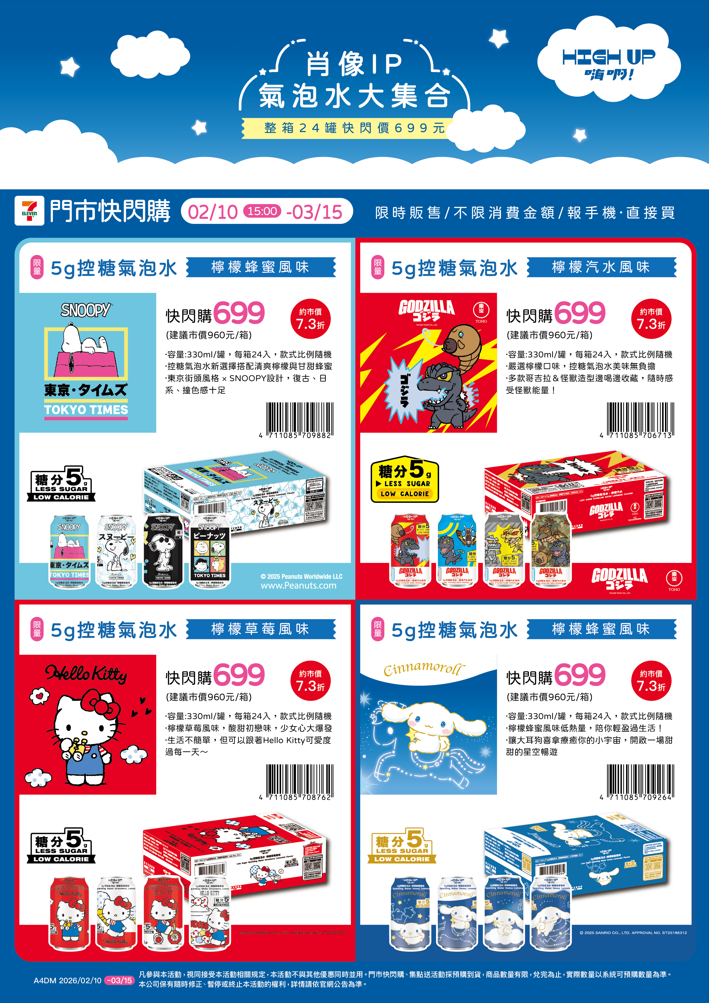 - 門市快閃購限定品項如下:自02/10(二)15:00開始:限量SNOOPY 5g控糖氣泡水-檸檬蜂蜜風味,共1款、限量GODZILLA 5g控糖氣泡水-檸檬汽水風味,共1款、限量HELLO KITTY 5g控糖氣泡水-檸檬草莓風味,共1款、限量大耳狗喜拿5g控糖氣泡水-檸檬蜂蜜風味,共1款,前述商品皆含「限量門市快閃購+備品」。