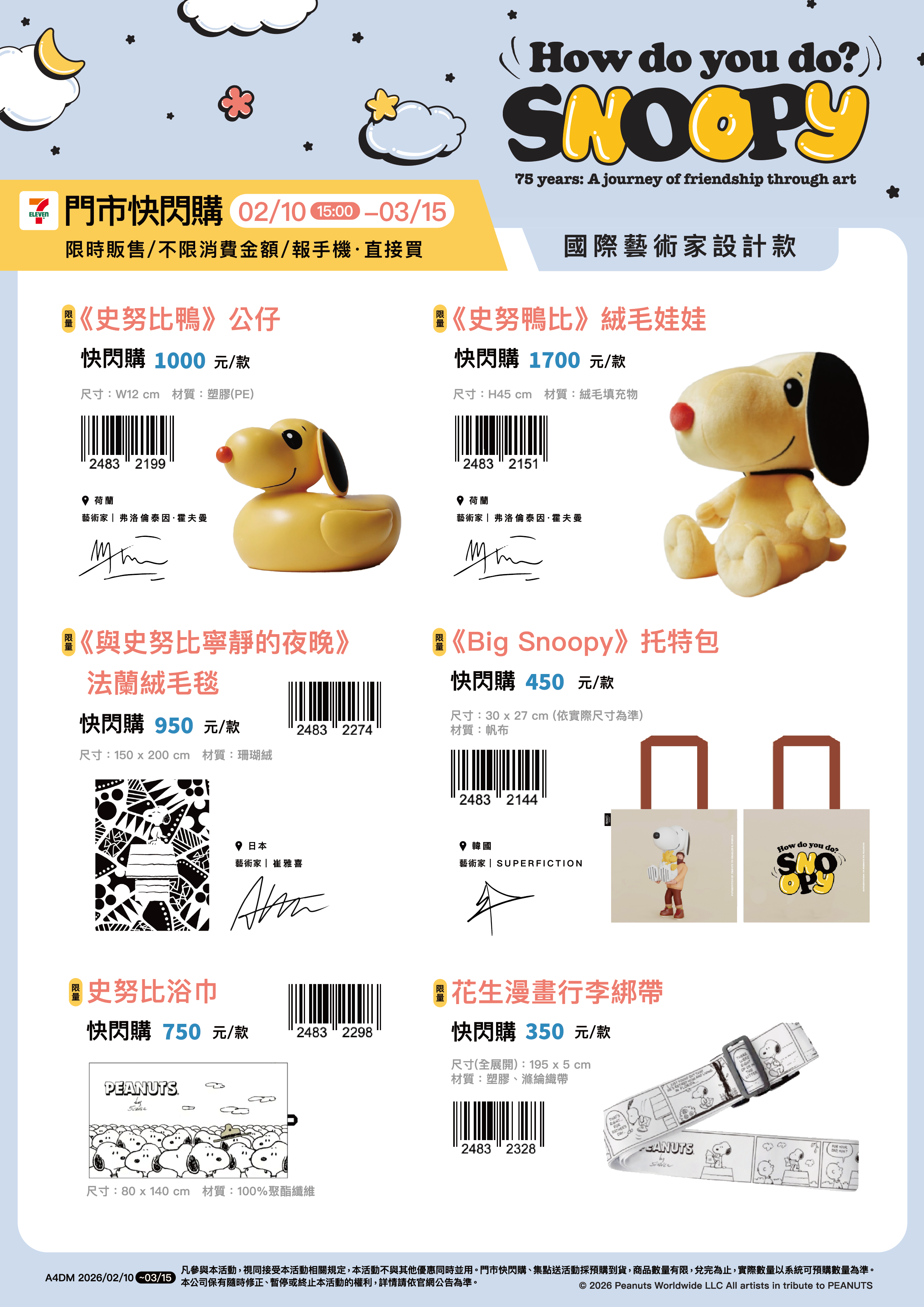 - 門市快閃購限定品項如下:自02/10(二)15:00開始:限量⟪史努比鴨⟫公仔,共1款、限量⟪史努鴨比⟫絨毛娃娃,共1款、限量⟪與史努比寧靜的夜晚⟫法蘭絨毛毯,共1款、限量⟪Big Snoopy⟫托特包,共1款、限量史努比浴巾,共1款、限量花生漫畫行李綁帶,共1款、限量甜甜圈鑰匙圈,共4款、限量陶瓷杯墊,共2款、限量⟪史努比鴨⟫鑰匙圈,共1款、限量金屬鑰匙圈,共2款,前述商品皆含「限量門市快閃購+備品」。