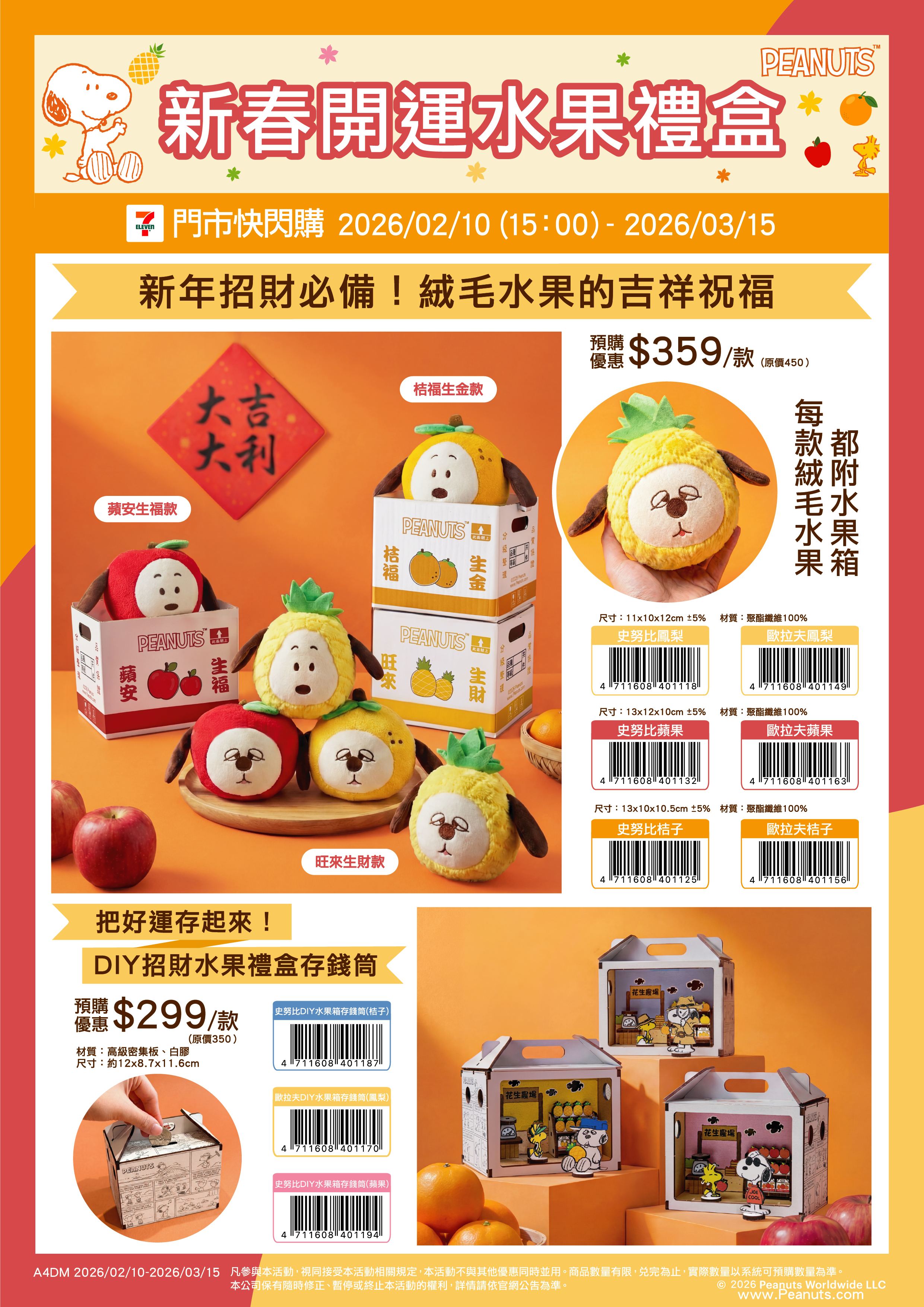 - 門市快閃購限定品項如下:自02/10(二)15:00開始至03/15(日):限量新年招財必備絨毛水果的吉祥祝福(附水果箱),共6款、限量DIY招財水果禮盒存錢筒,共3款、限量馬年戴馬帽大頭抱枕,共2款、限量馬年戴馬帽玩偶,共2款、限量騎木馬吊飾玩偶,共2款、限量史努比馬年裝扮玩偶,共1款、限量大吉小桔吊飾玩偶,共2款、限量史努比財神爺吊飾玩偶,共1款;限量金元寶歐拉夫吊飾玩偶,共1款、限量戴馬帽玩偶吊飾,共2款、限量毛線繡麻布袋,共2款、限量滿版麻布袋,共2款、限量扭蛋機娃娃機杯墊2入組,共1款、限量扭蛋機娃娃機滑鼠墊,共2款、限量史努比金墜,共1款、限量歐拉夫金墜,共1款、限量小黃鳥金墜,共1款、限量小黃鳥銀手鍊,共1款、限量史努比銀墜,共1款、限量歐拉夫銀手鍊,共1款、限量歐拉夫銀墜,共1款、限量SNOOPY防水拖鞋,共1款、限量MIT石墨烯四季暖被,共3款、限量MIT雙人床包三件組,共3款、限量Snoopy&friends⟪台灣辦桌!⟫系列公仔,共1款、限量長門簾,共1款、限量Snoopy海鮮泡麵寵物窩,共1款、限量Snoopy草莓寵物沙發,共1款、限量Snoopy漫畫寵物沙發,共1款、限量Snoopy棒球組寵物玩具,共1款、限量Snoopy寵物生日口水巾,共3款、限量Snoopy寵物生日帽,共3款,前述商品皆含「限量門市快閃購+備品」。