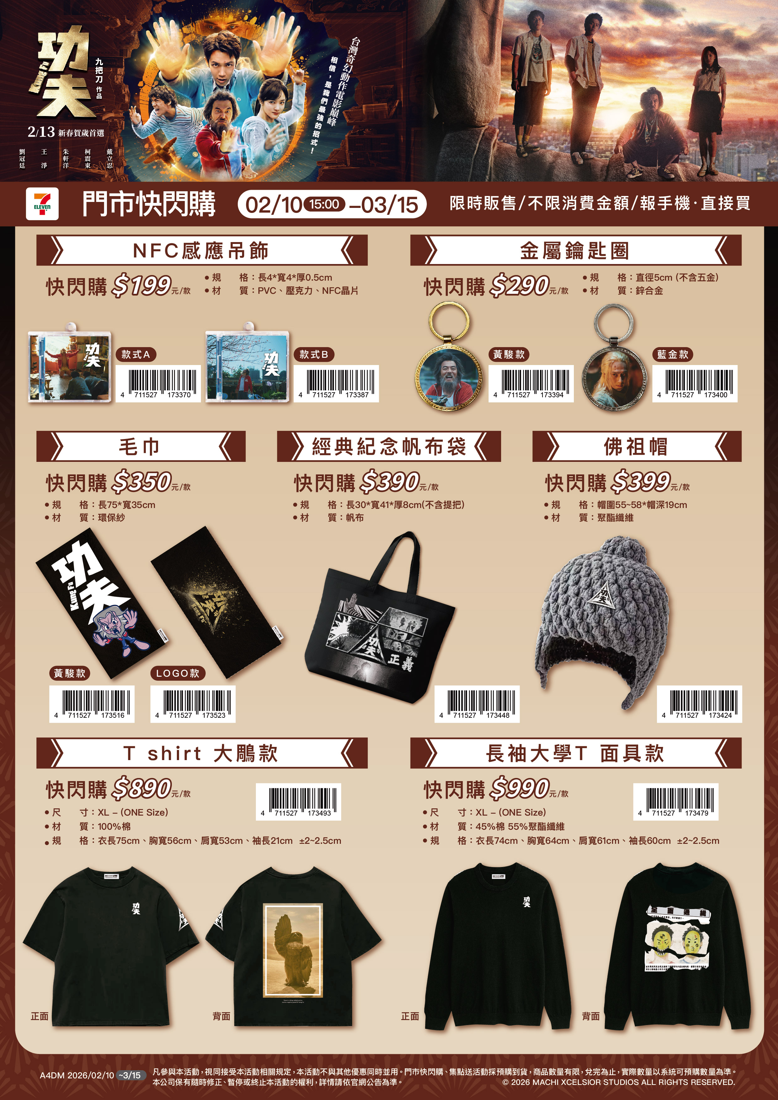 - 門市快閃購限定品項如下:自02/10(二)15:00開始:限量NFC感應吊飾,共2款、限量金屬鑰匙圈,共2款、限量毛巾,共2款、限量經典紀念帆布袋,共1款、限量佛祖帽,共1款、限量T-shirt大鵰款,共1款、限量長袖大學T面具款,共1款,前述商品皆含「限量門市快閃購+備品」。