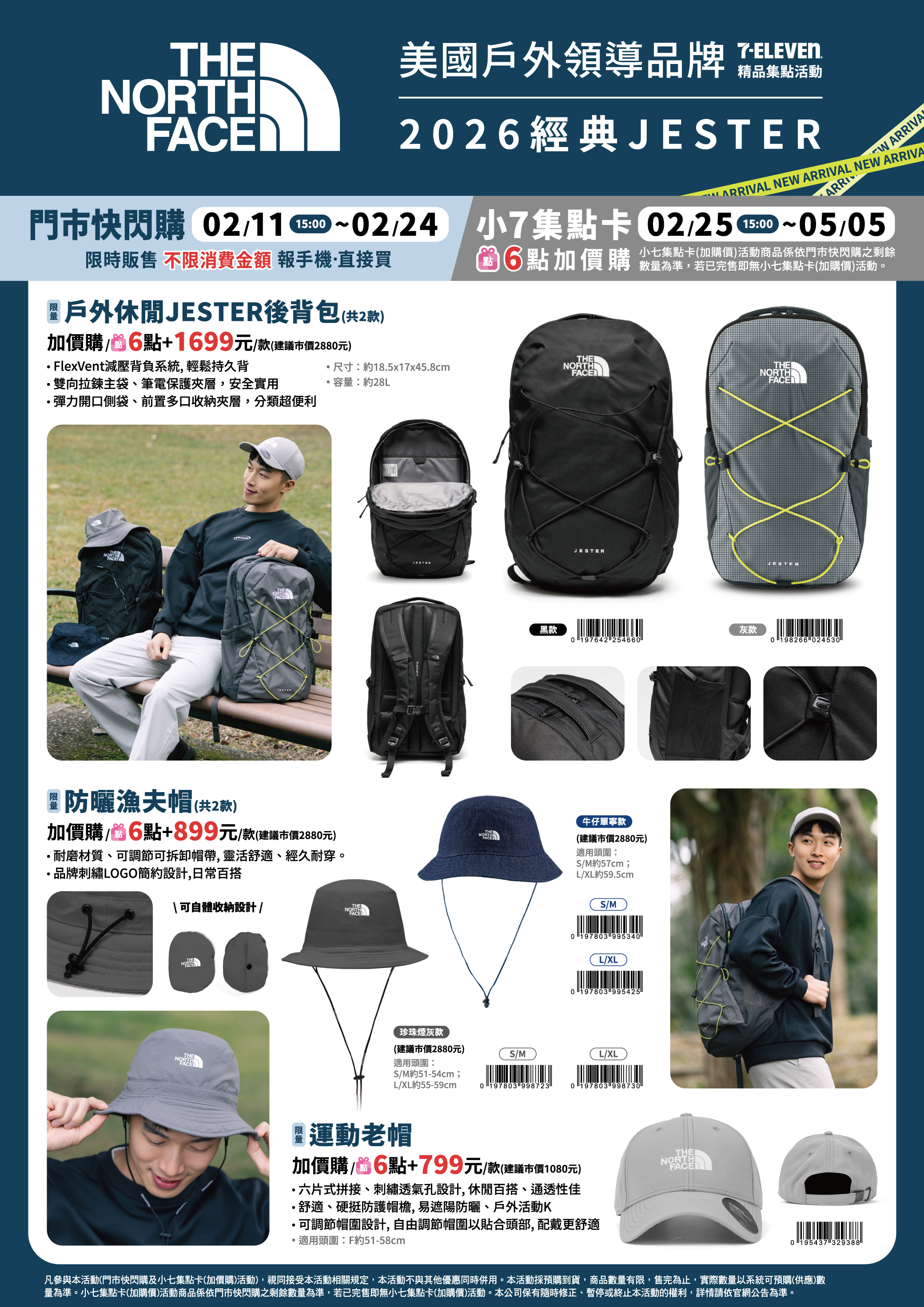 - 下列商品,自02/25(三)15:00開始:限量戶外休閒JESTER後背包,共2款、限量防曬漁夫帽,共2款、限量運動老帽,共1款,前述商品皆含「限量門市快閃購+限量集點送兌換+備品」。