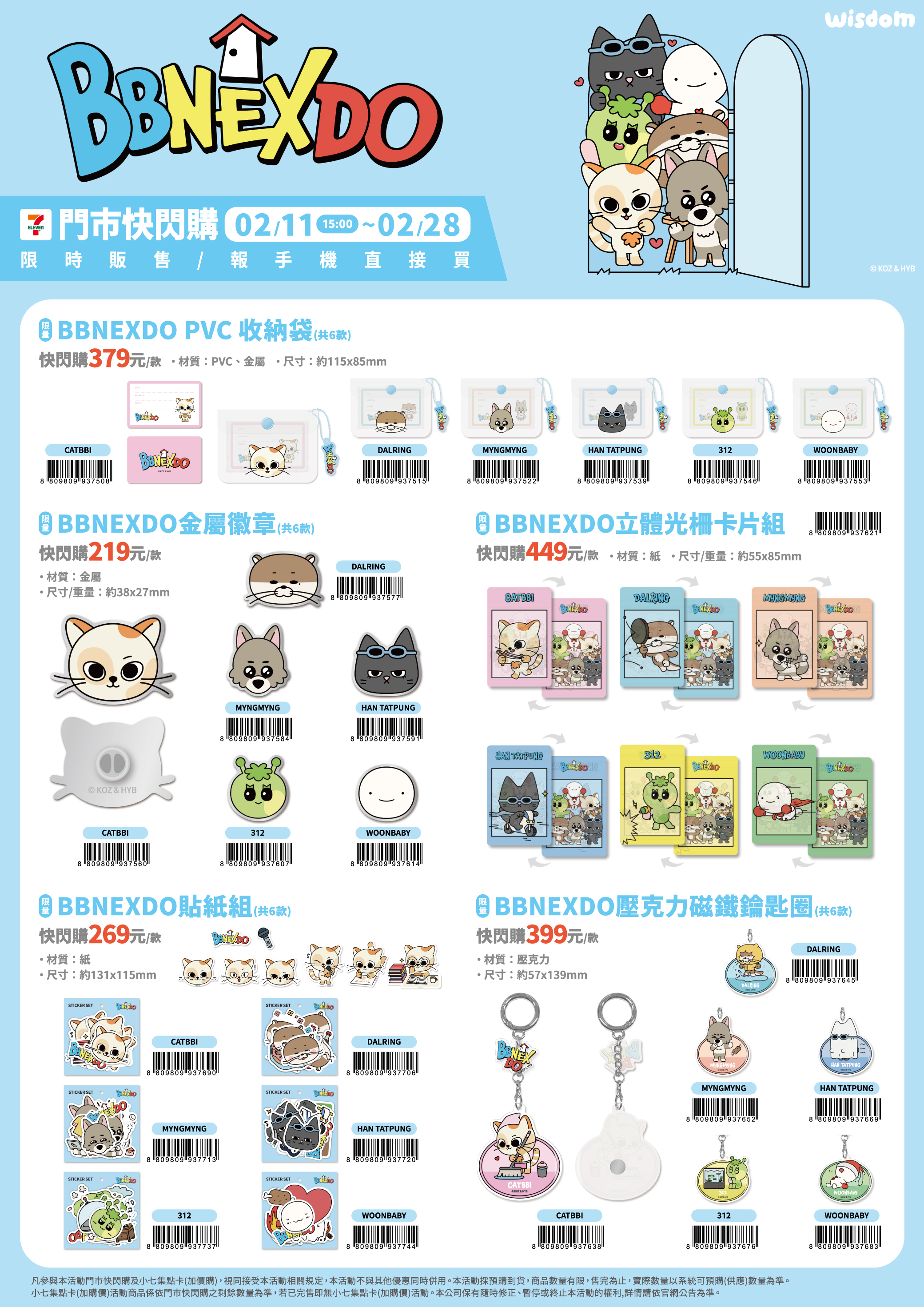 - 門市快閃購限定品項如下:自02/11(三)15:00開始:限量BBNEXDO PVC收納袋,共6款、限量BBNEXDO金屬徽章,共6款、限量BBNEXDO立體光柵卡片組,共1款、限量BBNEXDO貼紙組,共6款、限量BBNEXDO壓克力磁鐵鑰匙圈,共6款,前述商品皆含「限量門市快閃購+備品」。