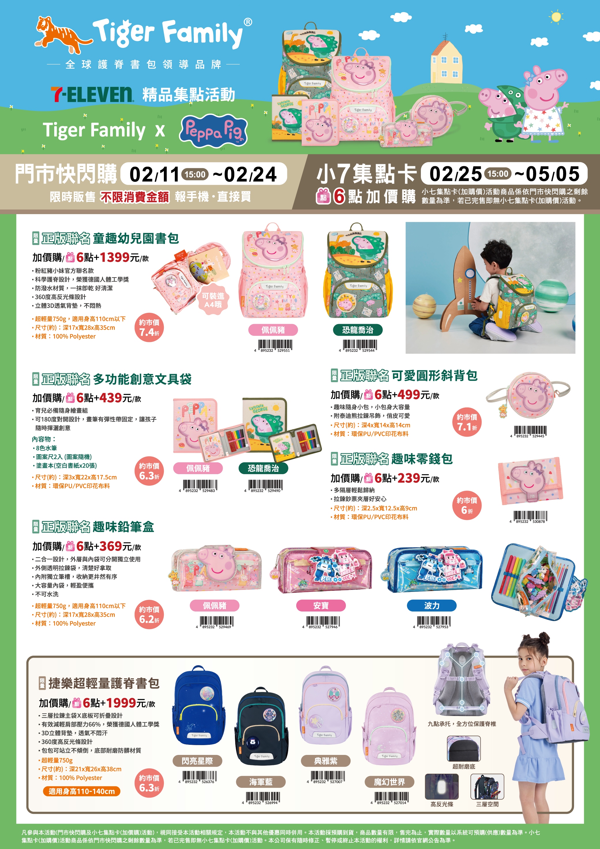 - 下列商品,自02/25(三)15:00開始:限量正版聯名童趣幼兒園書包,共2款、限量正版聯名多功能創意文具袋,共2款、限量正版聯名可愛圓形斜背包,共1款、限量正版聯名趣味零錢包,共1款、限量正版聯名趣味鉛筆盒,共3款、限量捷樂超輕量護脊書包,共4款,前述商品皆含「限量門市快閃購+限量集點送兌換+備品」。