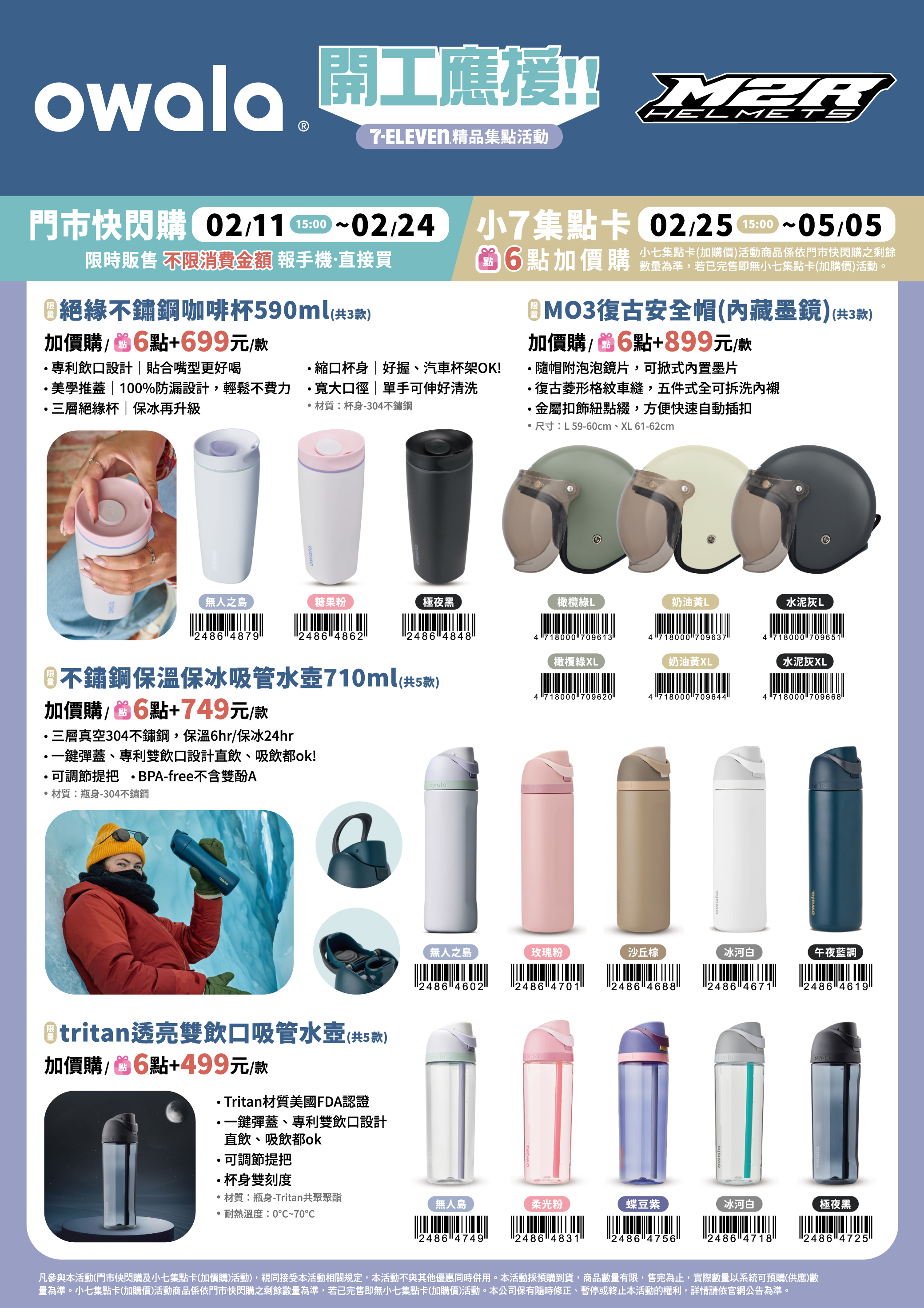 - 下列商品,自02/25(三)15:00開始:限量絕緣不鏽鋼咖啡杯590ml,共3款、限量MO3復古安全帽(內藏墨鏡),共3款、限量不鏽鋼保溫保冰吸管水壺710ml,共5款、限量tritan透亮雙飲口吸管水壺,共5款、限量輕量多功能後背包,共3款、限量經典鴨舌帽,共3款、限量城市旅人隨行後背包,共3款、限量經典漁夫帽,共3款、限量城市旅人兩用托特包,共4款、限量復古牛皮德訓鞋,共2款、限量多隔層防盜後背包,共3款、限量輕量手提/側背2用休閒包,共3款、限量輕奢鋼鍊錶,共1款、限量多功能托特/斜背包,共3款,前述商品皆含「限量門市快閃購+限量集點送兌換+備品」。