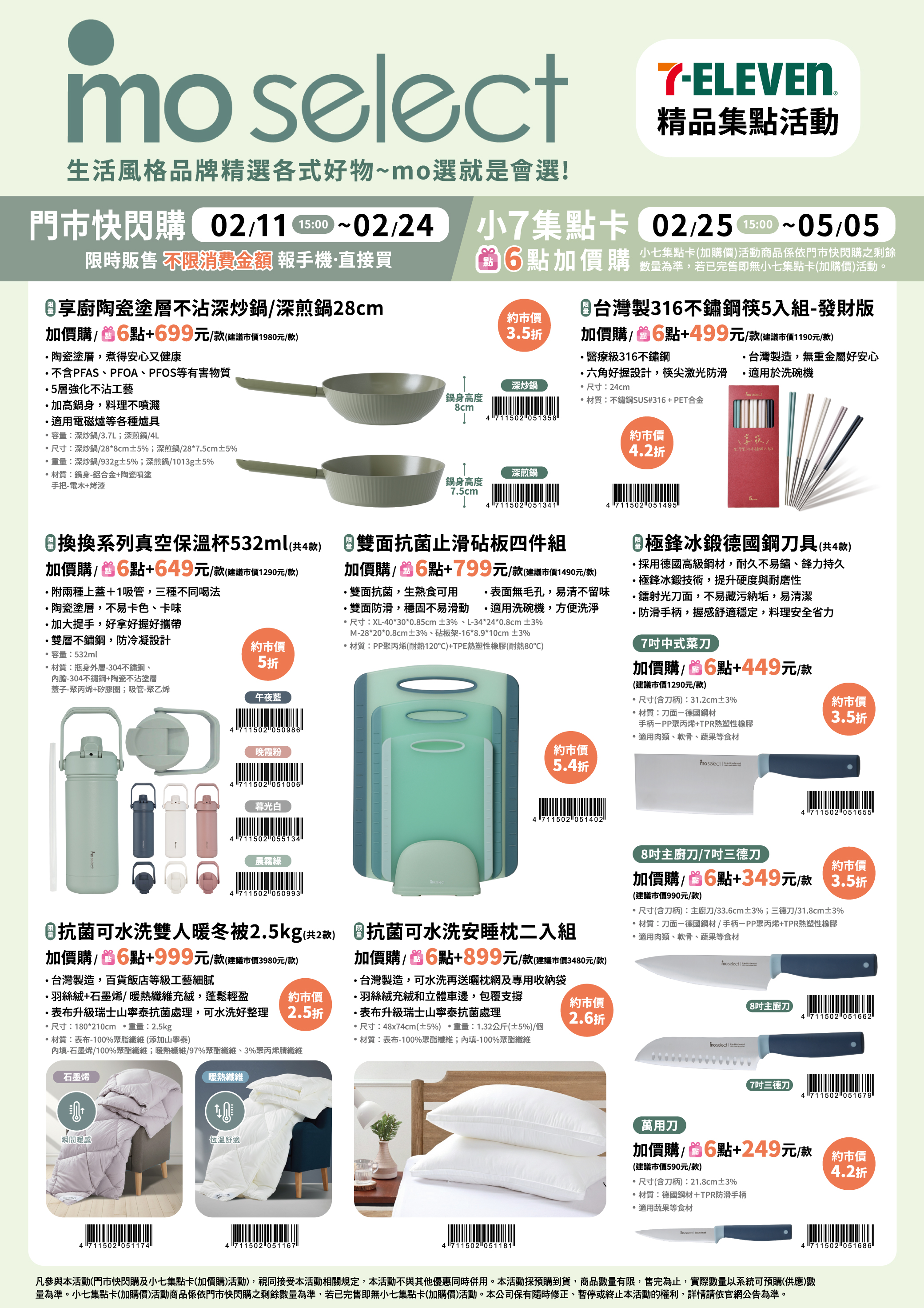- 門市快閃購限定品項如下:自02/11(三)15:00開始:限量享廚陶瓷塗層不沾深炒鍋/深煎鍋28cm,各1款、限量台灣製316不鏽鋼筷5入組-發財版,共1款、限量換換系列真空保溫杯532ml,共4款、限量雙面抗菌止滑砧板四件組,共1款、限量極鋒冰鍛德國鋼刀具,共4款、限量抗菌可水洗雙人暖冬被2.5kg,共2款、限量抗菌可水洗安睡枕二入組,共1款,前述商品皆含「限量門市快閃購+限量集點送兌換+備品」。