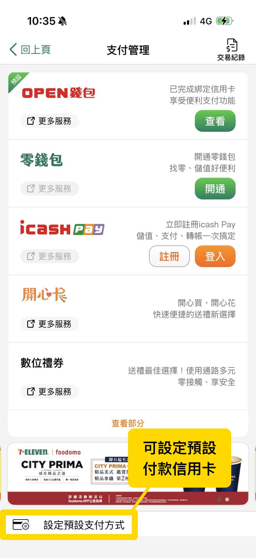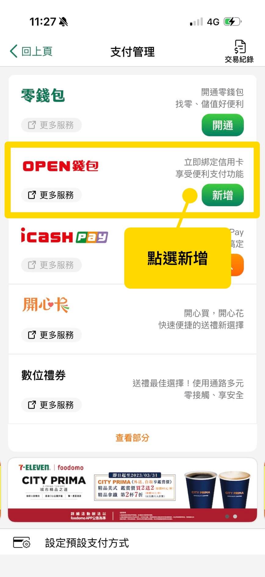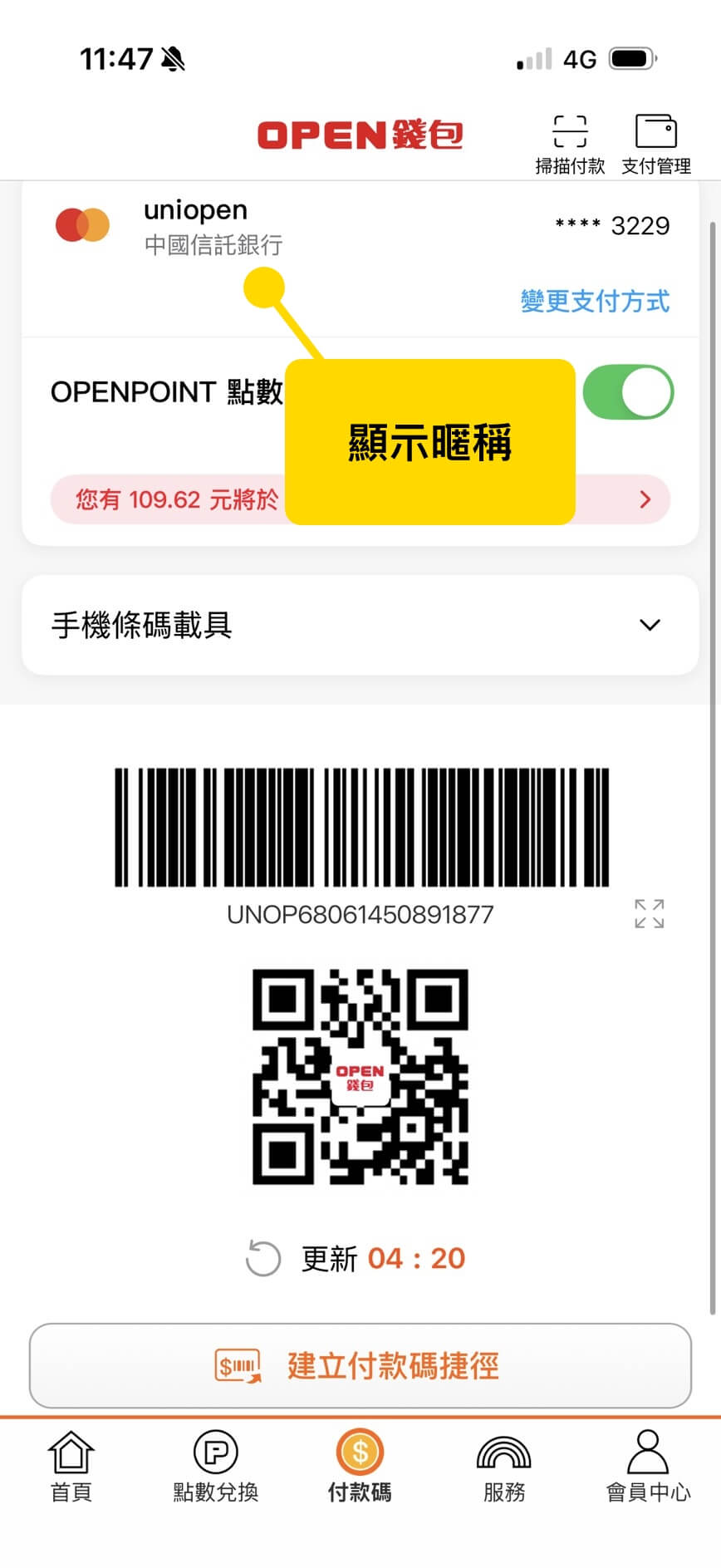 最便利的行動錢包內建於OPENPOINT APP中,開啟OPEN錢包綁定信用卡,出示支付條碼一指完成付款及累點,還可使用點數當現金折抵當次消費!